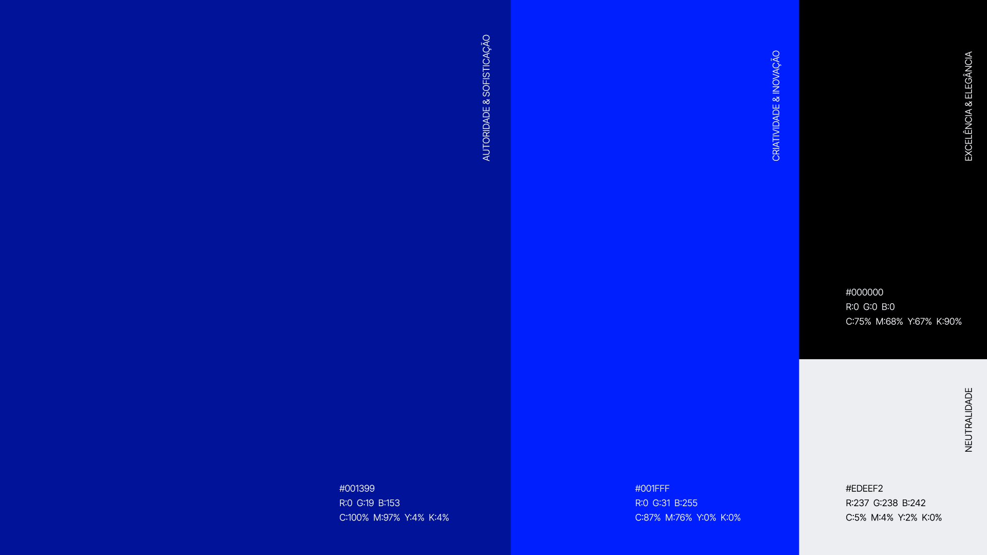 A paleta de cores é um reflexo direto da Identidade: sofisticada, intencional e estrategicamente poderosa. Cada cor foi selecionada para transmitir uma camada específica de nossa personalidade e valores, criando uma experiência visual coerente e de alto impacto que comunica nosso padrão de excelência antes mesmo de uma palavra ser lida.